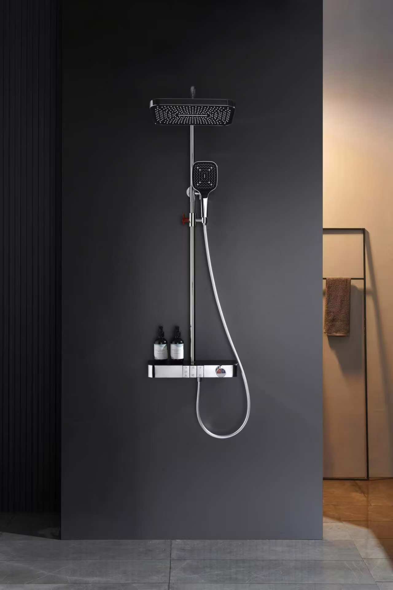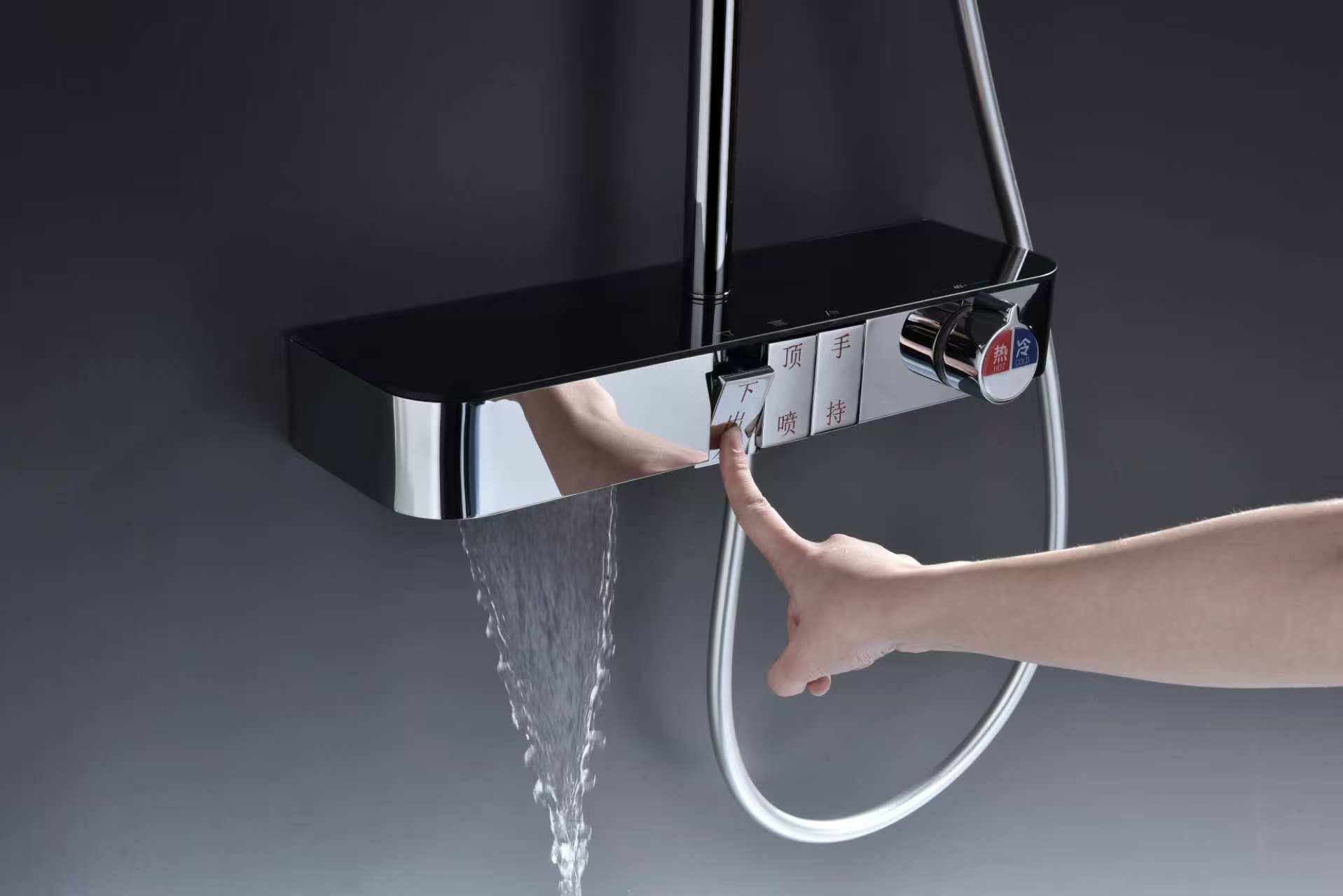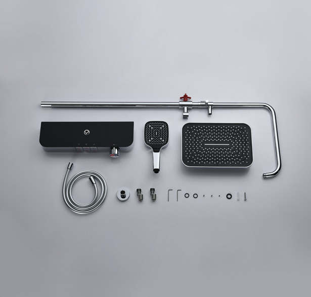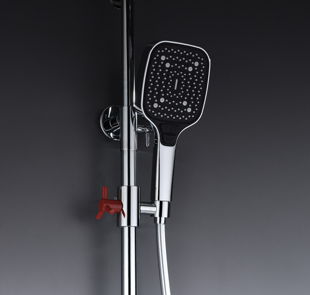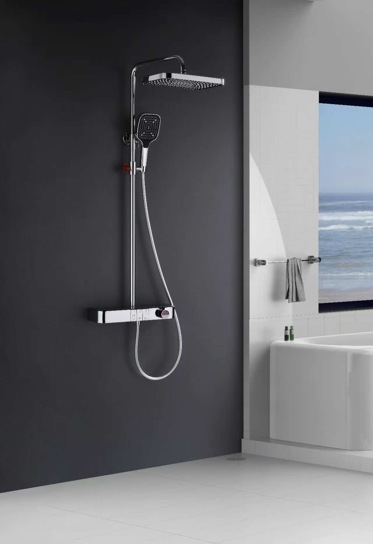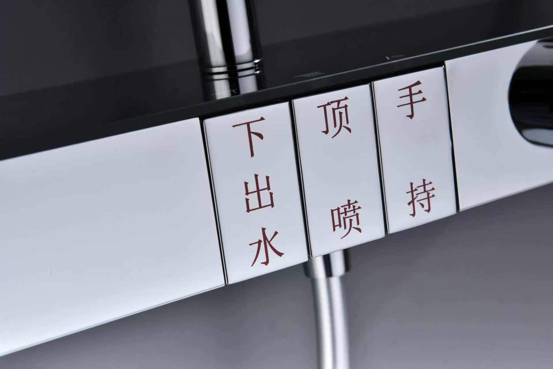产品主体采用铜材质恒温龙头,温度可调,印有高清红蓝冷热水标志.配有可暂停功能的花洒便于老人洗浴不要频繁使用水龙头开关,产品采用按键标示开关,方便明显识别防爆定喷花洒,配有1.5米双扣花洒软管。