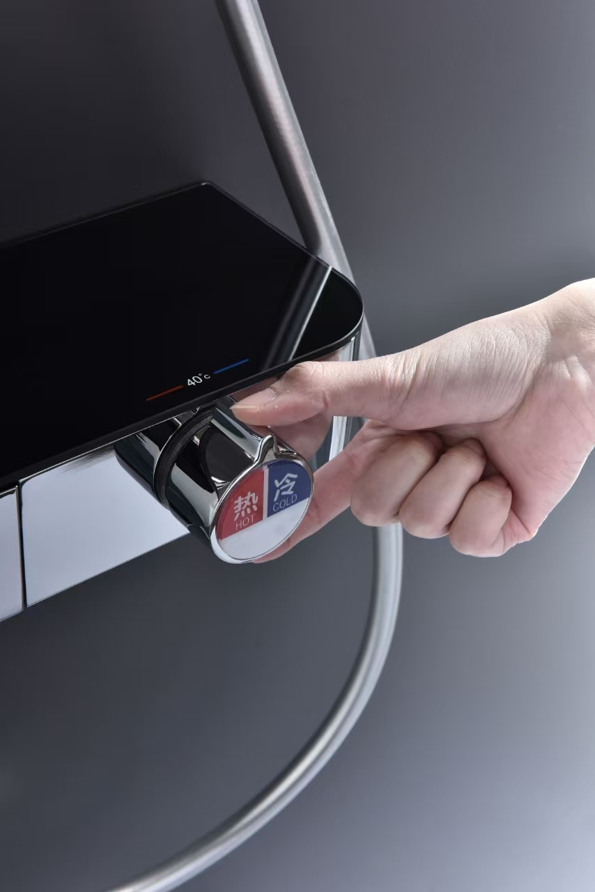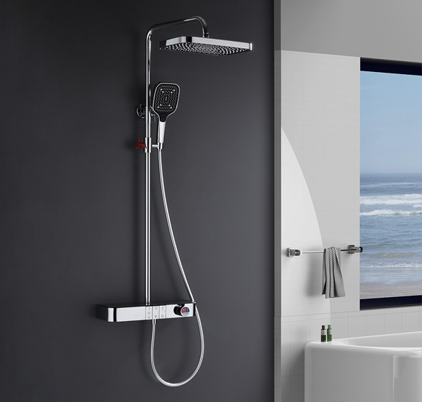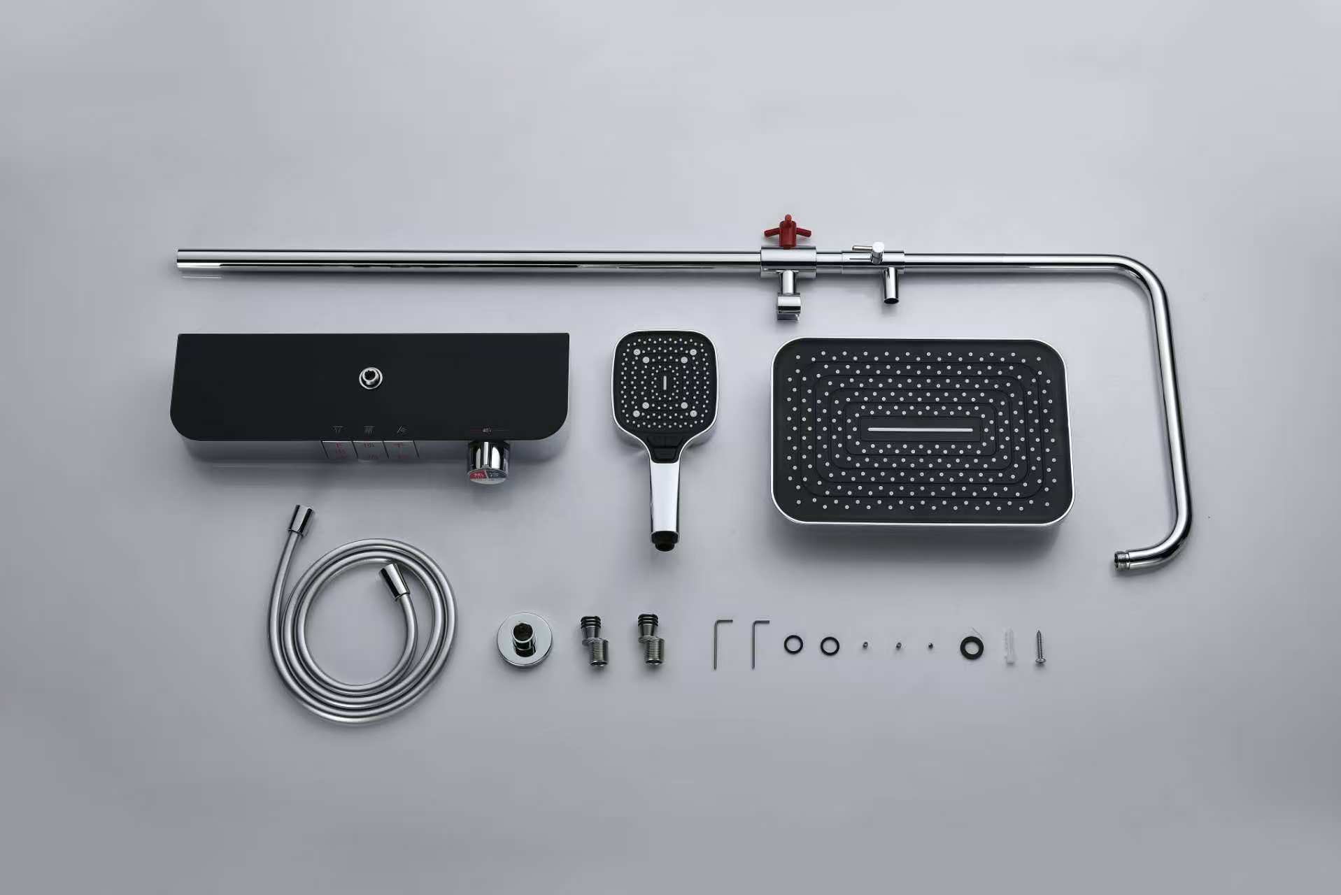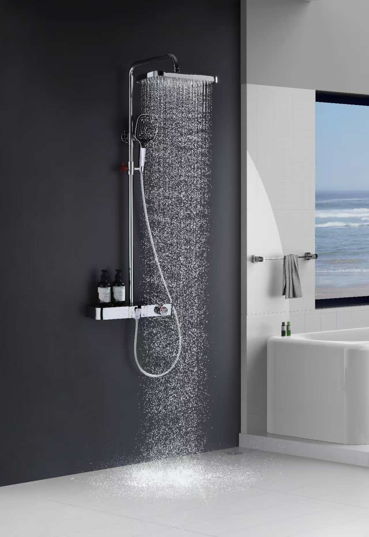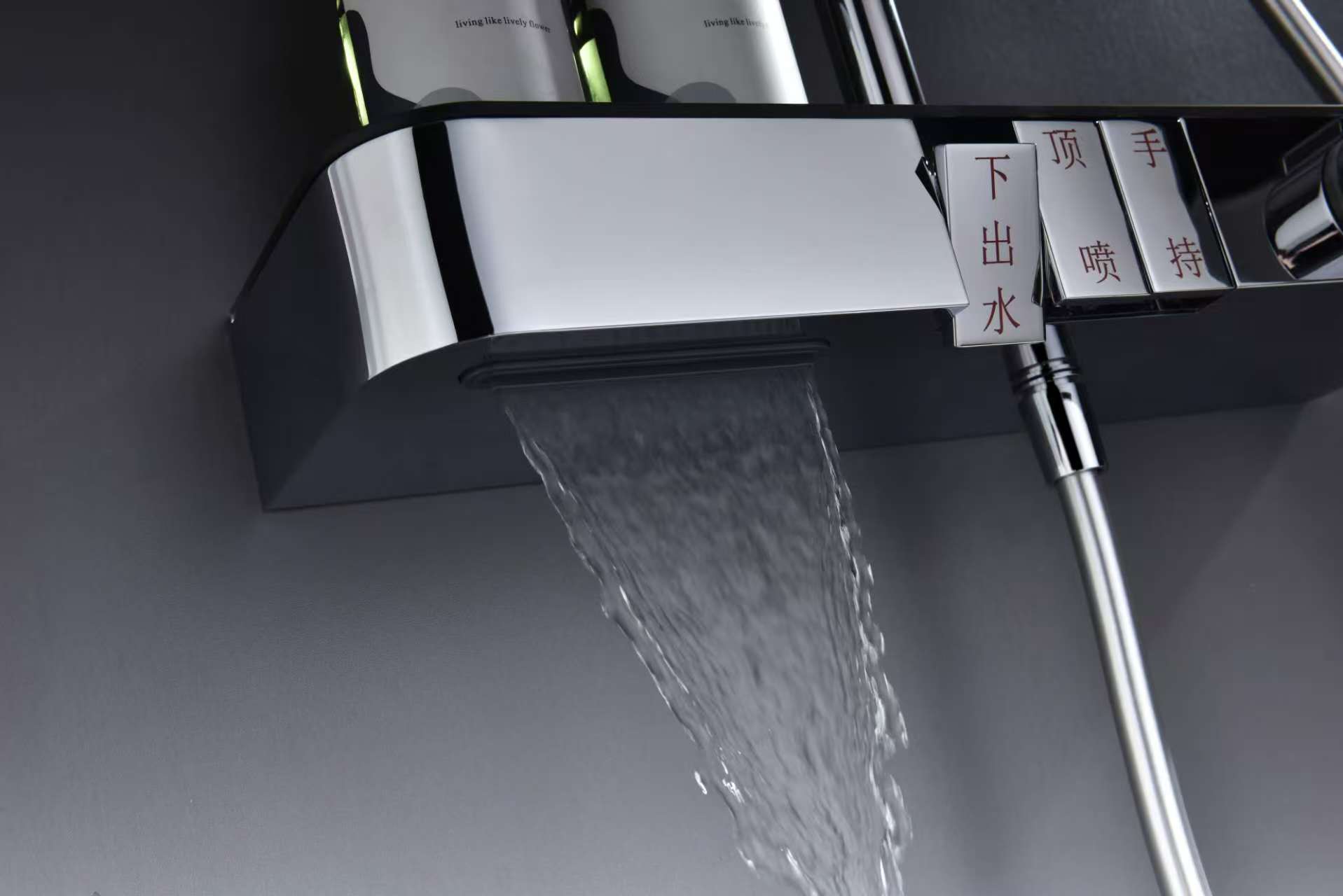 产品主体采用铜材质恒温龙头,温度可调,印有高清红蓝冷热水标志.配有可暂停功能的花洒便于老人洗浴不要频繁使用水龙头开关,产品采用按键标示开关,方便明显识别防爆定喷花洒,配有1.5米双扣花洒软管。
